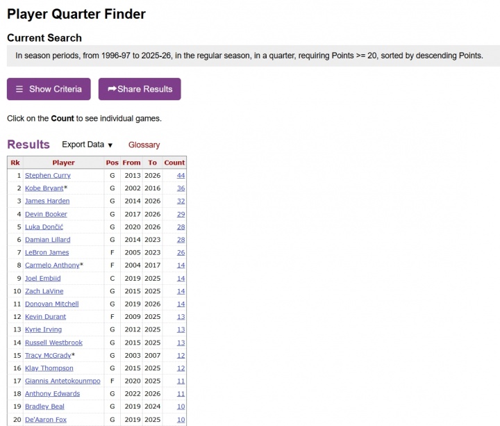 NBA历史单节20+TOP20如下: